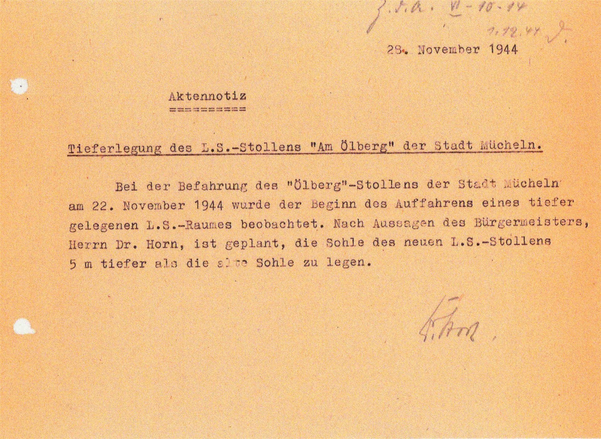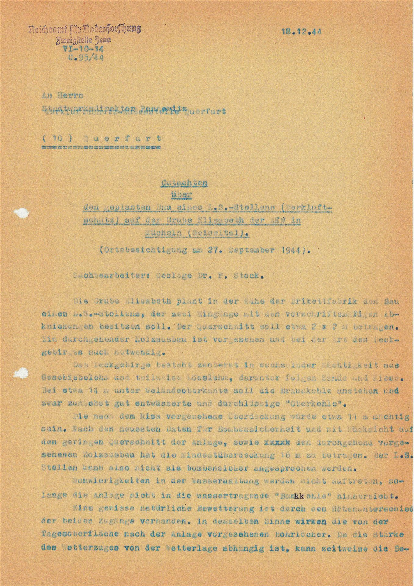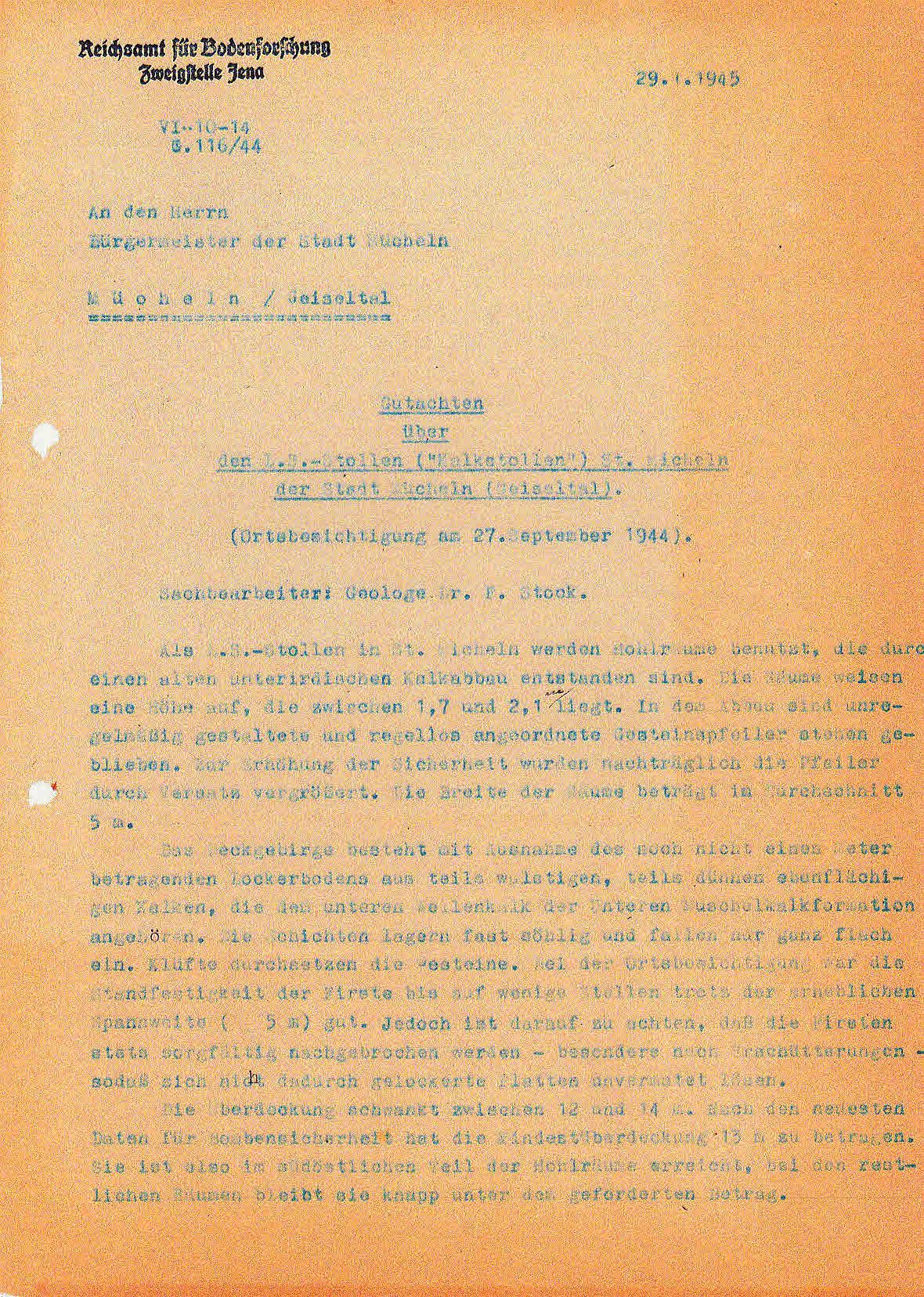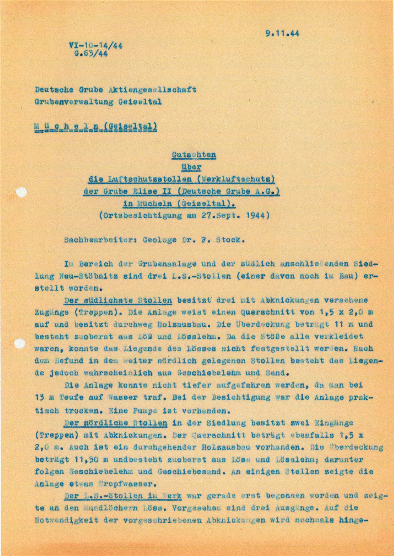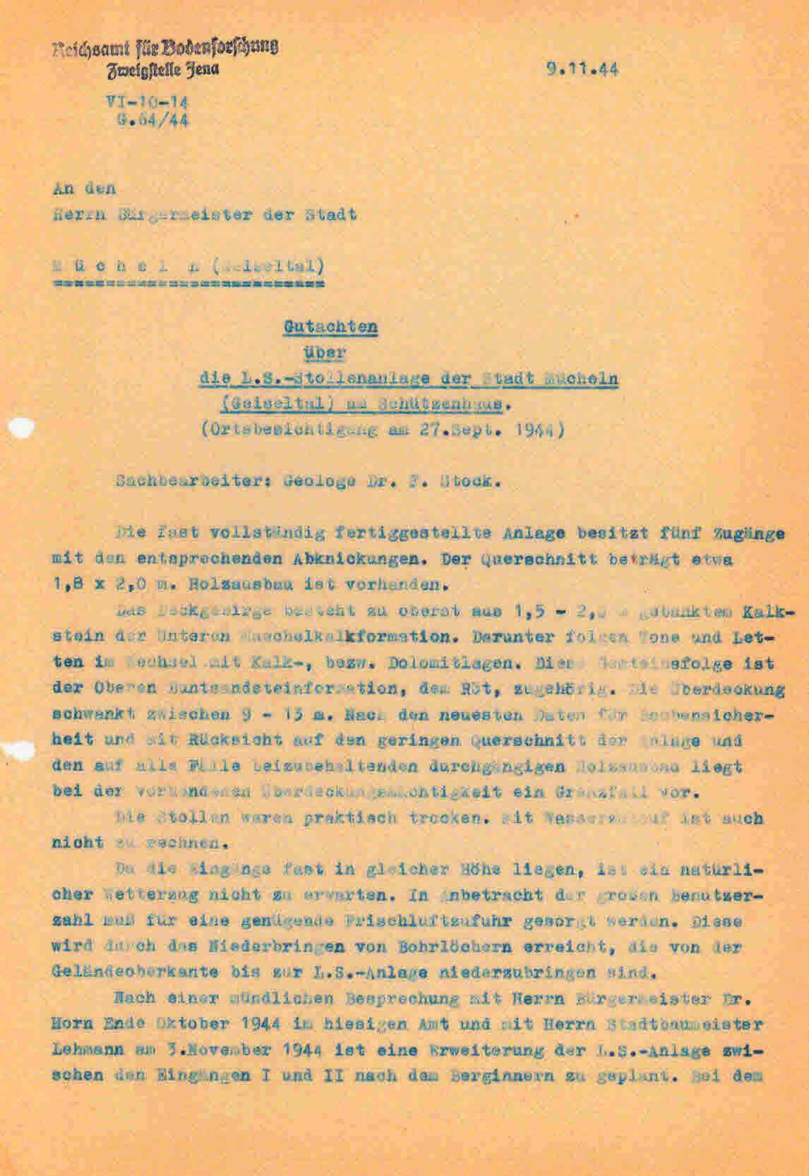 Mit Beginn der Bombardierungen im Mai 1944 der mitteldeutschen Treibstoffwerke, wurden auch im Geiseltal verstärkte Luftschutzmaßnahmen für die Zivilbevölkerung ergriffen. Dies geschah vorwiegend in Eigeninitiative der Städte und Kommunen. Für die Stadt Mücheln ist dies relativ gut dokumentiert. In seinen späteren Aufzeichnungen beschrieb der damalige Bürgermeister Horn die Situation so, dass er mit den Direktionen der Braunkohlen- und Treibstoffwerken überein kam, bombensichere Luftschutzstollen zu bauen. Hierzu suchte man geeignete Stellen in den Hanglagen der Stadt Mücheln mit einer Erddeckung von mindestens 10 m. Die Bergwerke lieferten das Grubenholz zur fachgerechten Abstützung und waren technisch beratend tätig. Durch die Stadt wurde mit Hilfe der Freiwilligen Feuerwehr und des Technischen Hilfsdienstes ein freiwilliger Arbeitsdienst organisiert. Um in den Besitz einer Bunkerkarte zu gelangen, waren 75 Arbeitsstunden zu leisten. Bei einer vierköpfigen Familie waren dies 300 h. Der Einlass wurde durch Bunkerwarte streng kontrolliert, was im späteren Verlauf des Krieges zu Konflikten führte. So lies man Monteure, die im Geilenberg- Programm für Wiederaufbau der Treibstoffwerke, in die jeweiligen Werke abkommandiert waren nicht in die Luftschutzstollen herein. Diese Firmen drohten mit Abzug ihrer Gefolgschaftsmitglieder gegenüber dem RLM, welches sich zum Eingreifen genötigt fühlte.