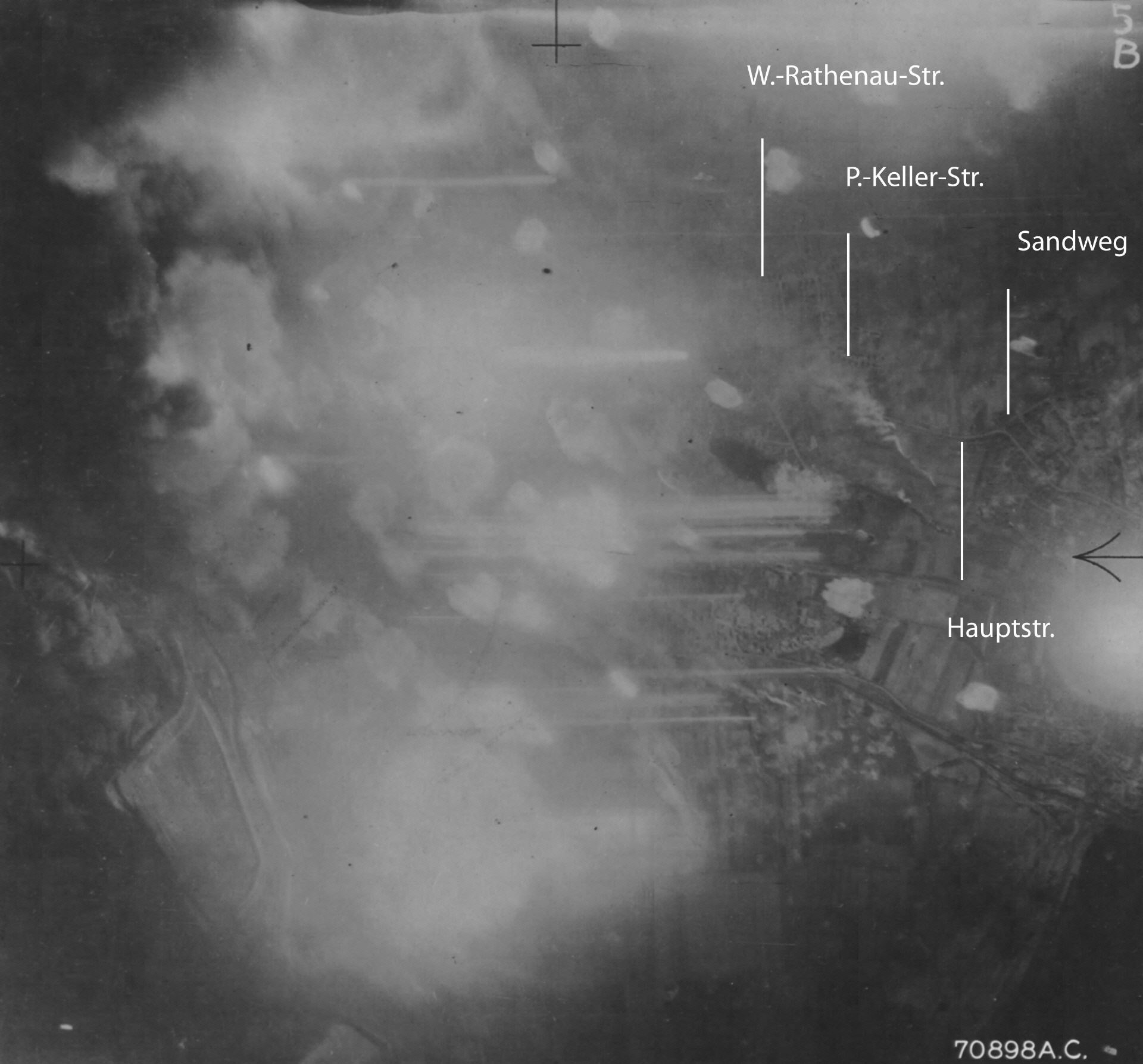 Das Squadron No. 9 war eines von zwei Squadronen der RAF zum Abwurf von Spezialbomben. Zusammen mit dem Squadron No. 617 versenkte man z.B. am 12.11.1944 das Schlachtschiff "Tirpitz". In der Nacht vom 8. zum 9. April 1945 entsandte Squadron No. 9 insgesamt 18 Avo Lancaster ausgerüstet mit 18 Tallboy- Spezialbomben. Von 22:40 Uhr bis 22:57 Uhr fallen 17 Tallboys (6t- bunkerbrechende Spezialbombe) auf das Treibstoffwerk. Eine Maschine drehte auf Grund von Triebwerksproblemen bereits 21:15 Uhr ab und klinkt seine Last bei Cochem aus. Die Bomben rasen, mit ihrem Gewicht von 6t, in annähender Überschallgeschwindigkeit auf den Boden zu. Als sie sich mit ihrer gehärteten Stahlspitze bis zu 30m in den Boden bohren, kommt es auf Grund der Verdichtung der Erdmassen, zu einem hellen roten Blitz (Piezoelektrischer Effekt).