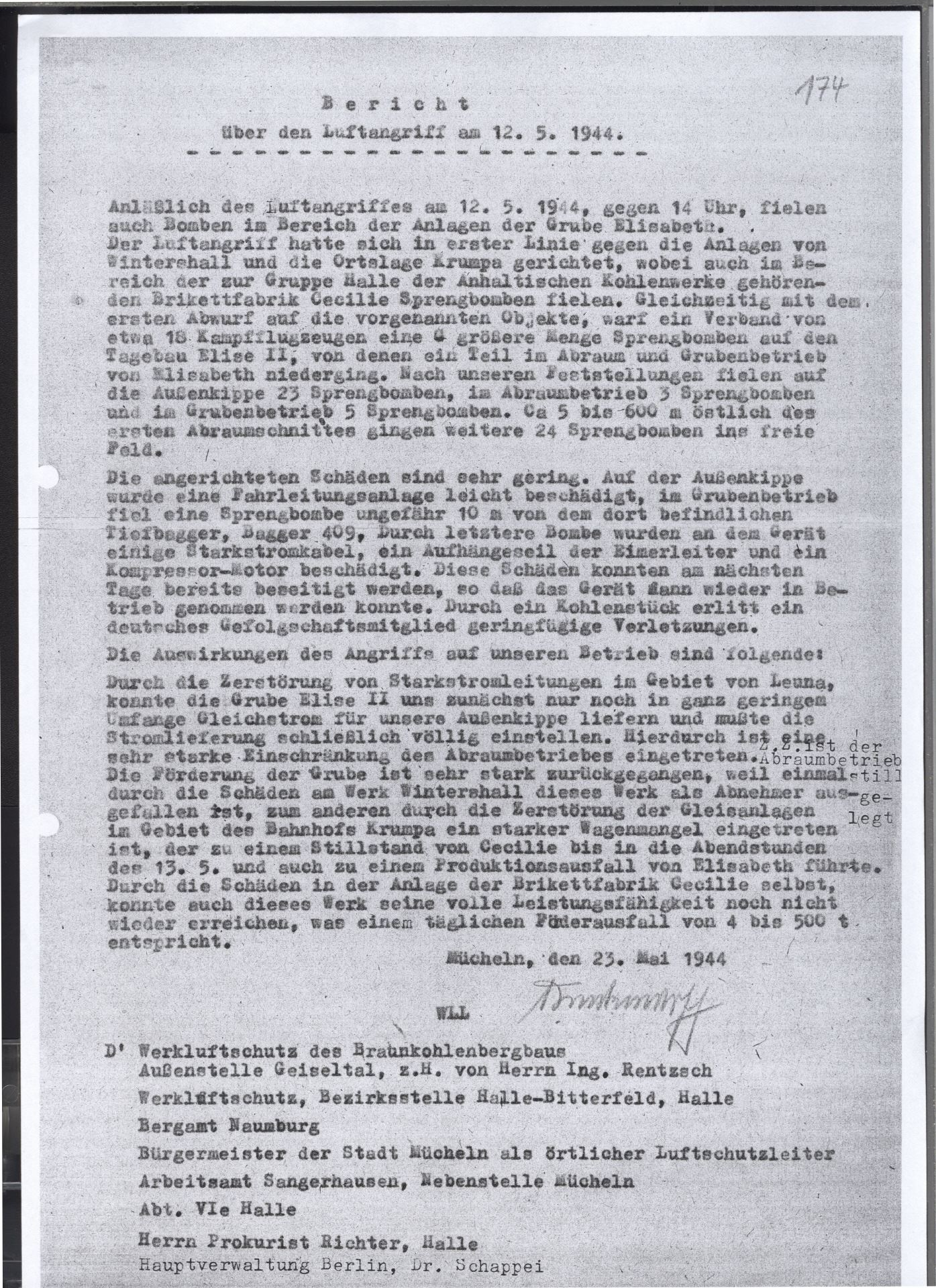 Horst K. bemerkte zwar die Flugzeuge, die sich in 12000 m Höhe bewegten, hörte jedoch nicht die Bombardierung. Die Grube schottete alle Geräusche ab. Erst als nach einer halben Stunde 2 LKW's erschienen und die Fahrer die Arbeiter hecktisch aufforderten mit zu kommen, bemerkten diese, dass etwas passiert sein musste. Bei der Fahrt in das Werk, durch das nördliche Eingangstor, konnte Horst K. noch keine größeren Beschädigungen sehen. Als sie sich jedoch dem südlichen Haupttor (späterem Jugendtor) näherten, wurden die Zerstörungen sichtbar. Die Hauptlast fiel in den westlichen Teil des Werkes. Ein großer Teil davon in die Gemeinde Krumpa. Die wartenden Omnibusse der Firma Eckardt, auf dem Vorplatz, lagen auf der Seite und brannten. Am Ende des Tages waren 159 Opfer zu beklagen, darunter Frauen und Kinder. Um die große Zahl an Toten aufzubahren, wurde der Saal der Gaststätte "Zum blauen Stern" requiriert. Die Gemeinde sah sich gezwungen einen 2. Friedhof anzulegen, der in kürzester Zeit mit Hilfe der umliegenden Kohlewerken und Wintershall hergerichtet wurde. Dieser ist heute immer noch existent und als "Heldenfriedhof" umgangssprachlich bekannt.
