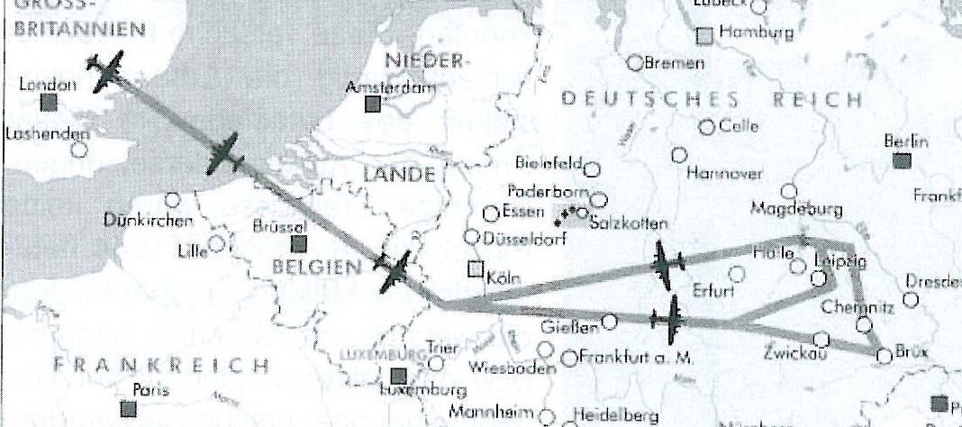 Gegen 8:00 Uhr starteten die ersten Maschinen von Ihren Heimatbasen, um sich in einem festgelegten Korridor über Südengland zu versammeln. Die Überflüge der ca. 950 Maschinen (Weitere Ziele waren Hydrierwerke in Brüx, Böhlen, Zeitz und Maschinen- u. Flugzeugwerke in Zwickau u. Chemnitz) über den englischen Kanal, erfolgt bis ca. 11:10 Uhr zwischen Schelde und Calais. Danach überquerte man Belgien und änderte den Süd/ Ost - Kurs über Koblenz/ Frankfurt a.M. in einen östlichen Kurs Richtung Plauen. Bei Plauen drehten die Maschinen nördlich ein. Um ca. 14:00 Uhr erreichten die Maschinen das Treibstoffwerk Lützkendorf. Da es kurz vor dem Schichtwechsel war, standen die Busse der Firma Eckardt (Omnibusbetriebe Freyburg/U.) bereits wartend auf dem Haupttorplatz, um die Gefolgschaftsmitglieder aus der Naumburger Gegend zurück zu bringen.