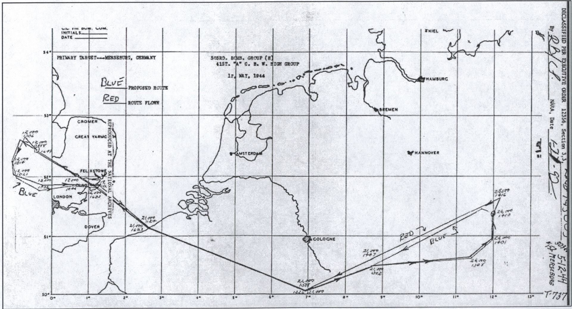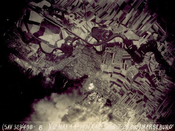 Am 12.Mai 1944 flog die gesamte 1st Air Division der 8. US Air Force auf ihre zugewiesenen Ziele Leuna und Lützkendorf zu. Über dem Rhein- Main Gebiet werden die Bomber Pulks von mehrer deutschen Jagdgeschwadern attackiert. Ebenso auf dem darauf folgenden späteren Rückflug. In einer Dokumentation von Martin Papst (Die Angriffe auf Leuna und Merseburg am Ende des II. Weltkrieges), liest man auf S. 21, dass für die Flakstellungen um Merseburg 12:25 Uhr der Befehl "Feuerbereitschaft!" ausgerufen wurde. Eine Stunde später gab es in Merseburg "Fliegeralarm!"(13:20- 13:30 Uhr).