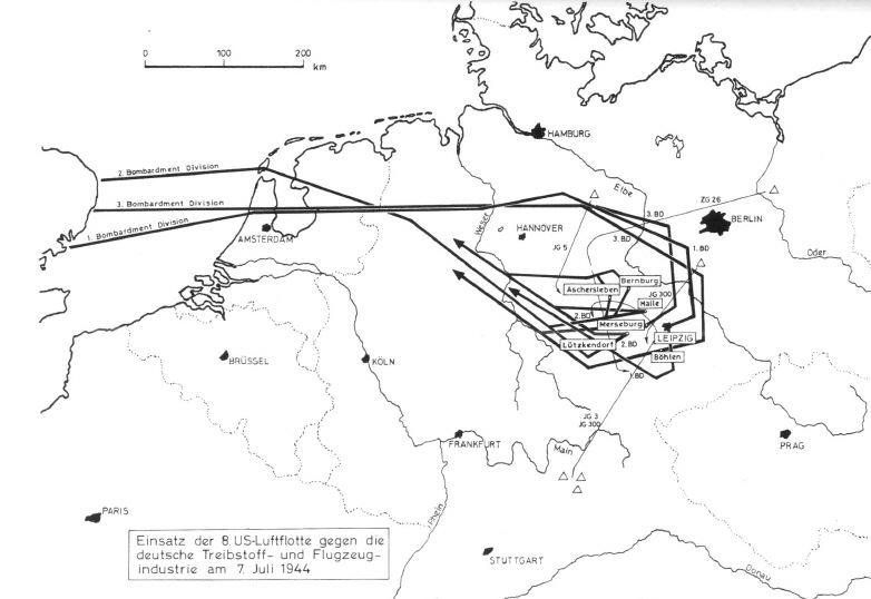 "Very Deadly Target", war die Bleistiftnotiz eines amerikanischen Tail- Gunners (Heckschütze) hinter diesem Tagesziel. Und in der Tat war der Flakgürtel um Merseburg/ Leipzig seit dem 12. Mai 1944 enorm verstärkt worden. Bis zu 500 Flak- Geschütze bildeten jetzt den Ring um die so wichtigen Hydrier- und Treibstoffwerke. Zudem wurden die dt. Jagdgeschwader umgruppiert, um einen besseren Schutz der Anlagen zu gewährleisten. Die 8. US Air Force sollten an diesem Tag 37 Bomber verlieren und 6 Jäger (Strategic Operations 8. US Air Force).