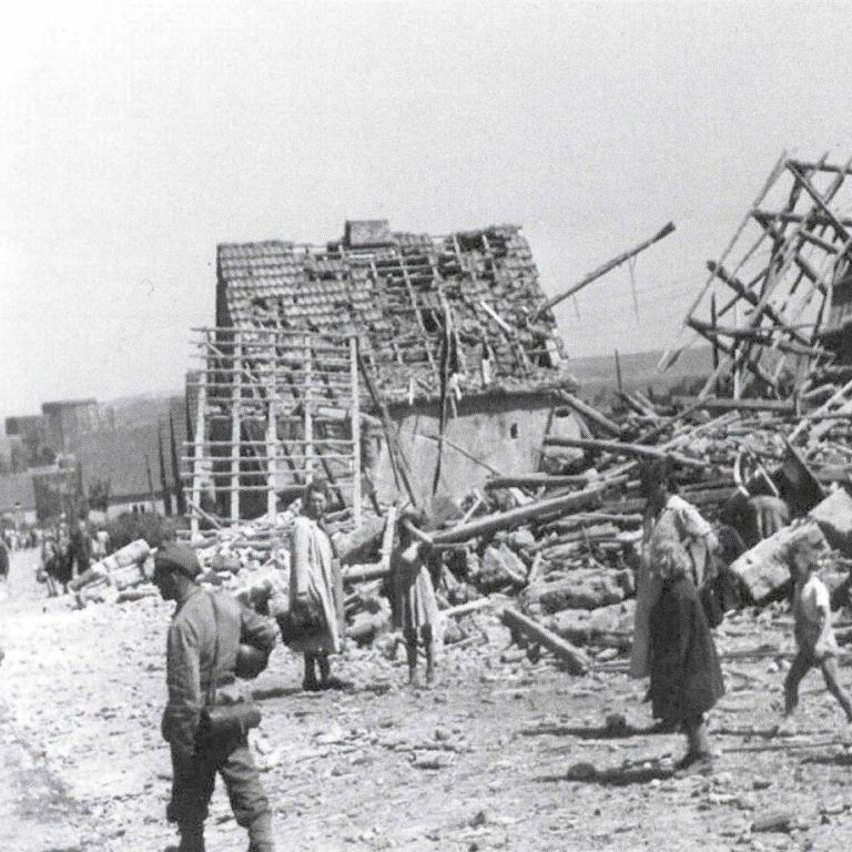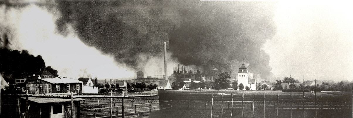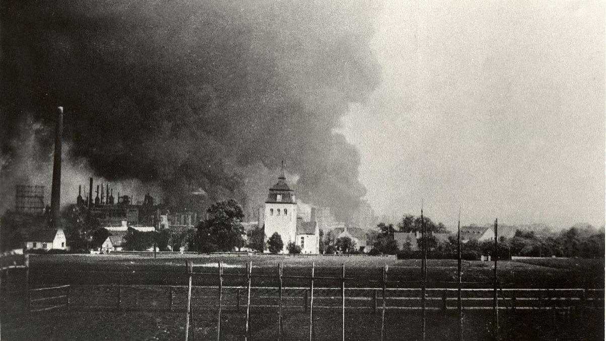 Fliegeralarm bestand von 09:01 Uhr bis 10:57 Uhr. Die Bombenabwürfe erfolgen von 09:10 Uhr bis 10:15 Uhr.