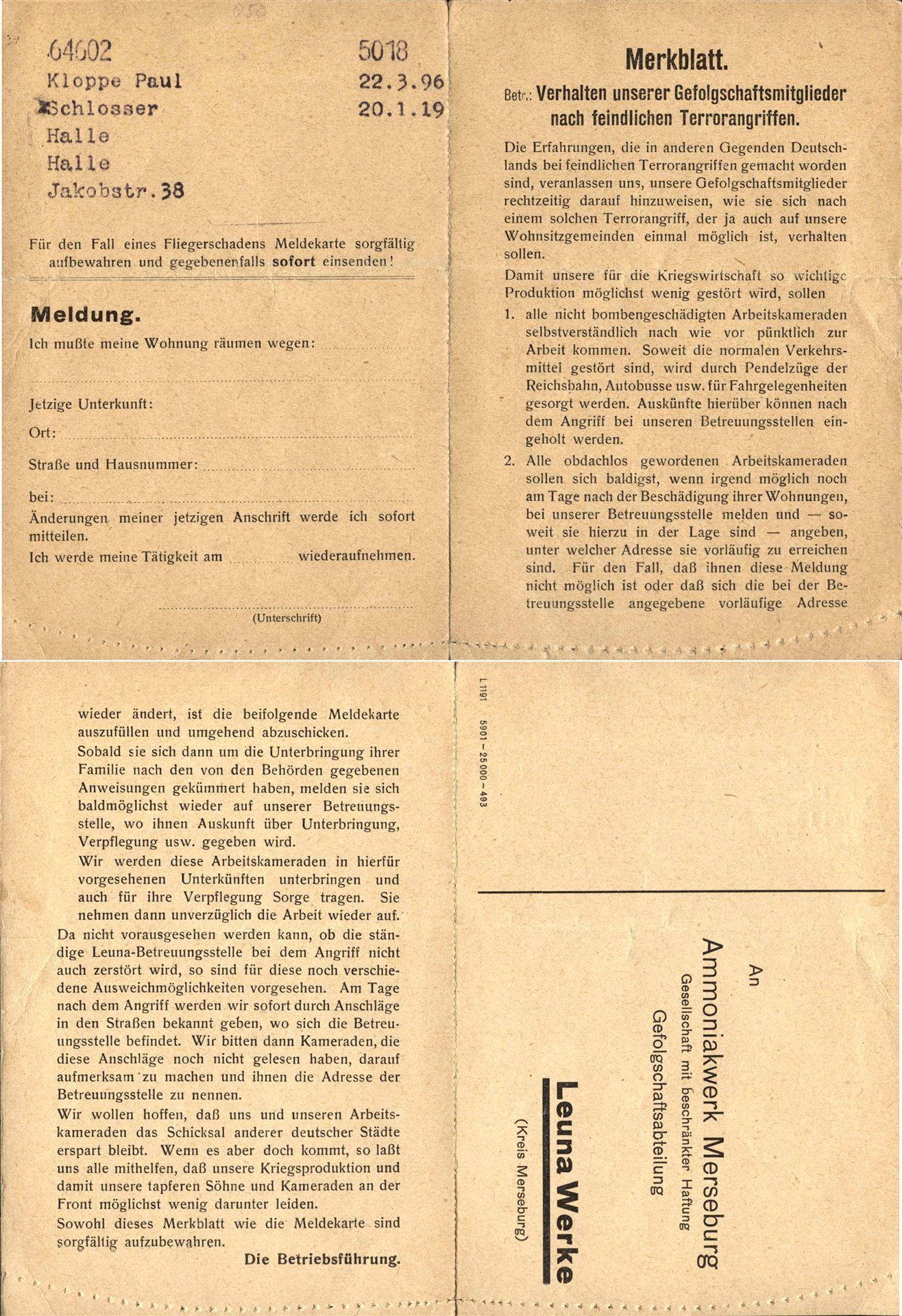 "...Die Masse der Feindflugzeuge (etwa 1000 viermot. mit starkem Jagdschutz) flog über Meppen - Hameln in den Raum Leipzig - Halle - Dresden. Angriff zw. 09.53 Uhr und 10.13 Uhr auf mitteldeutsches Industriegebiet, Schwerpunkt Leuna- Werke. Im Werk schwere Schäden, insbes. im Südteil der Anlage. Einige Bombenabwürfe auf Merseburg..." Besatzungsmitglieder der einzelnen BG berichteten später von insgesamt über 90 größeren Explosionen, die infolge der Bombenabwürfe oder nachfolgenden Explosionen entstanden. Dabei soll es eine sehr große und alles überragende Explosion gegeben haben, die wahrscheinlich durch die gleichzeitige Explosion mehrere Tanks oder Gasometer entstanden ist. Eine Rauchwolke, die sich 6 bis 7 Km in die Höhe erstreckte, war weithin sichtbar. Spätere Auswertungen geben an, dass nur 8- 10% der abgewofen 10887 Bomben im Zielgebiet explodiert sind. Weitere 10% wurden auf Scheinanlagen abgeworfen. Der Gesamtschaden der Angriffe vom 28. und 29. Juli 1944 wird im Bericht des US Strategic Bombing Survey auf 66.320.000,- RM beziffert. Diese Summe setzt sich aus 21.955.000,- RM an Gebäudeschäden zusammen und 44.365.000,- RM an Materialschäden.