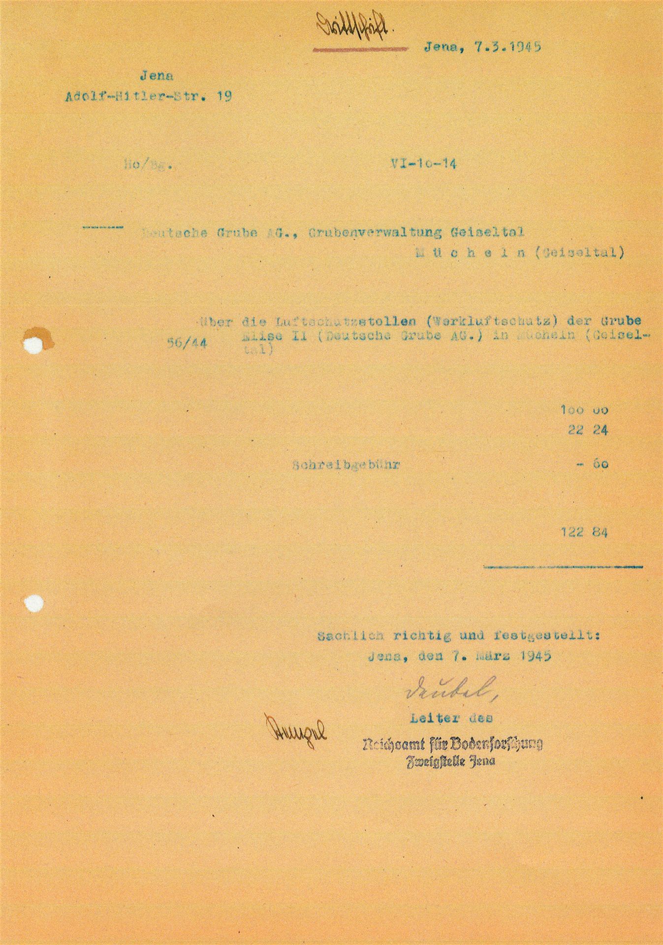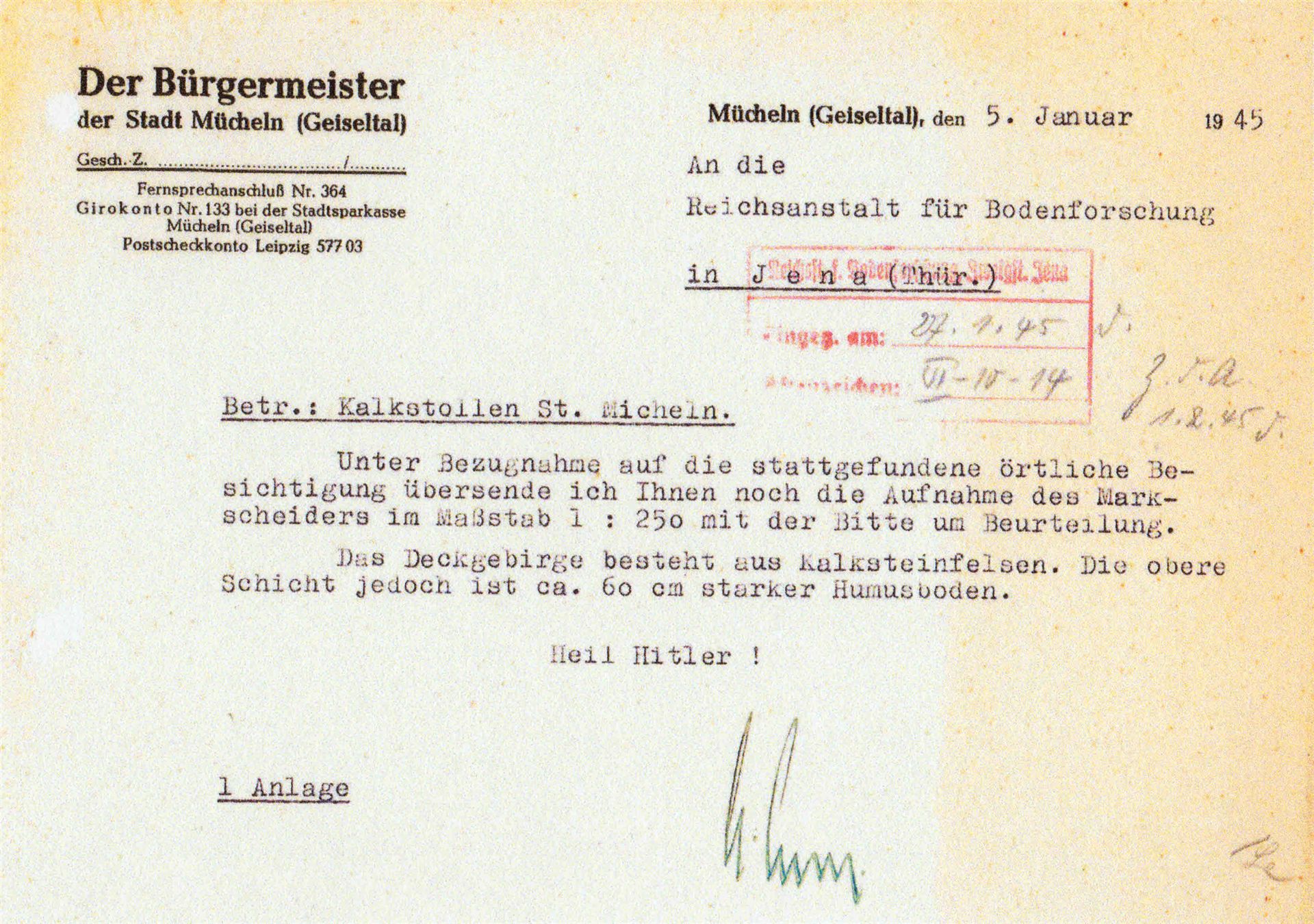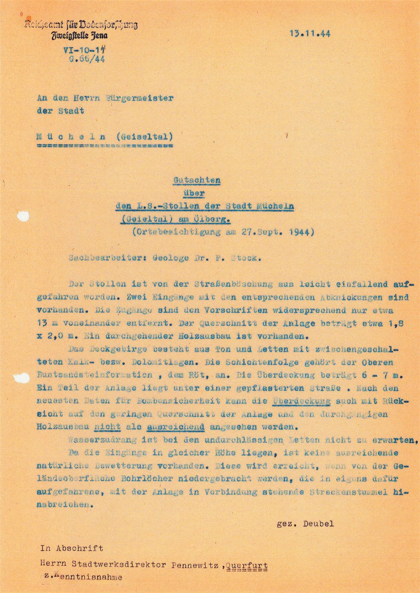 Mit Beginn der Bombardierungen im Mai 1944 der mitteldeutschen Treibstoffwerke, wurden auch im Geiseltal verstärkte Luftschutzmaßnahmen für die Zivilbevölkerung ergriffen. Dies geschah vorwiegend in Eigeninitiative der Städte und Kommunen. Für die Stadt Mücheln ist dies relativ gut dokumentiert. In seinen späteren Aufzeichnungen beschrieb der damalige Bürgermeister Horn die Situation so, dass er mit den Direktionen der Braunkohlen- und Treibstoffwerken überein kam, bombensichere Luftschutzstollen zu bauen. Hierzu suchte man geeignete Stellen in den Hanglagen der Stadt Mücheln mit einer Erddeckung von mindestens 10 m. Die Bergwerke lieferten das Grubenholz zur fachgerechten Abstützung und waren technisch beratend tätig. Durch die Stadt wurde mit Hilfe der Freiwilligen Feuerwehr und des Technischen Hilfsdienstes ein freiwilliger Arbeitsdienst organisiert. Um in den Besitz einer Bunkerkarte zu gelangen, waren 75 Arbeitsstunden zu leisten. Bei einer vierköpfigen Familie waren dies 300 h. Der Einlass wurde durch Bunkerwarte streng kontrolliert, was im späteren Verlauf des Krieges zu Konflikten führte. So lies man Monteure, die im Geilenberg- Programm für Wiederaufbau der Treibstoffwerke, in die jeweiligen Werke abkommandiert waren nicht in die Luftschutzstollen herein. Diese Firmen drohten mit Abzug ihrer Gefolgschaftsmitglieder gegenüber dem RLM, welches sich zum Eingreifen genötigt fühlte.
